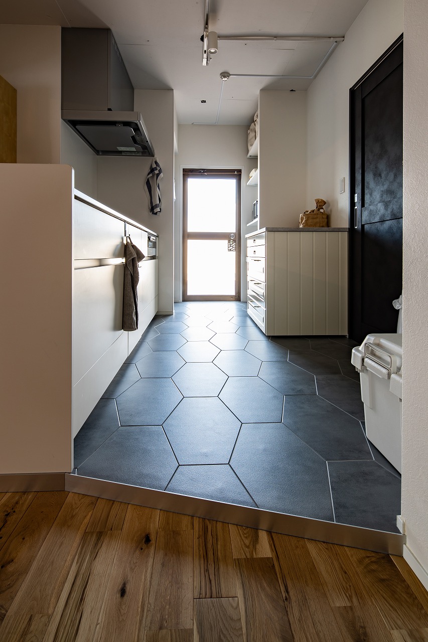 でもタイルだと冷たくて足元が冷えてしまいそう、物を落としたら割れてしまいそうだなと思って少し迷っていたら鳳建築さんから、ヘキサゴン形を伸ばした感じのフロアタイルを提案してもらいました。その素材なら迷っていた点も解消されるし、色も良くてとても気に入ったのでキッチンだけでなく洗面所にも色違いで取り入れました!